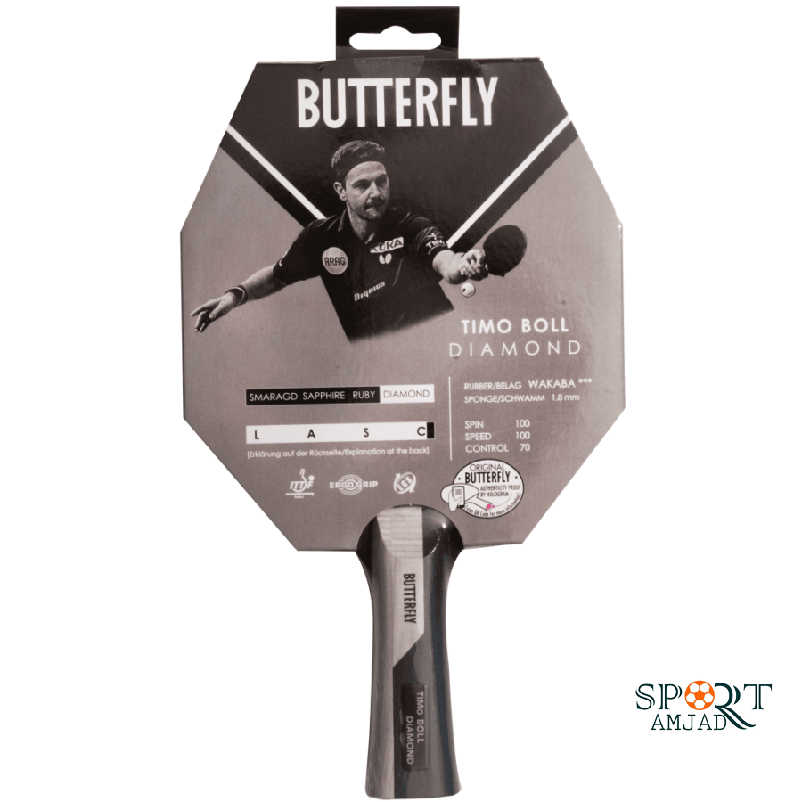 يتميز تيمو بول دايموند بشفرة قوية من 5 طبقات مع مقبض جذاب ومريح على شكل مقعر. هذا جنبا إلى جنب مع فراشة ITTF المعتمدة من مطاط واكابا الأحمر والأسود مع الإسفنج 1.8 مم يوفر الخفافيش مع دوران جيد وسرعة جيدة والتحكم الممتاز. حافة الشفرة محمية بشريط جانبي للفراشة.