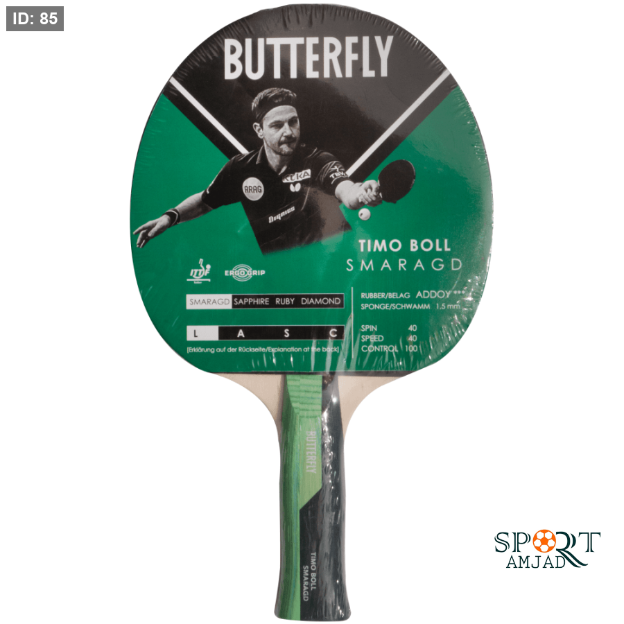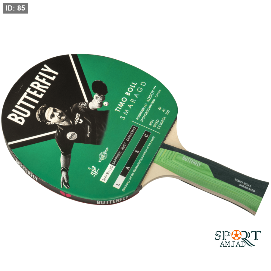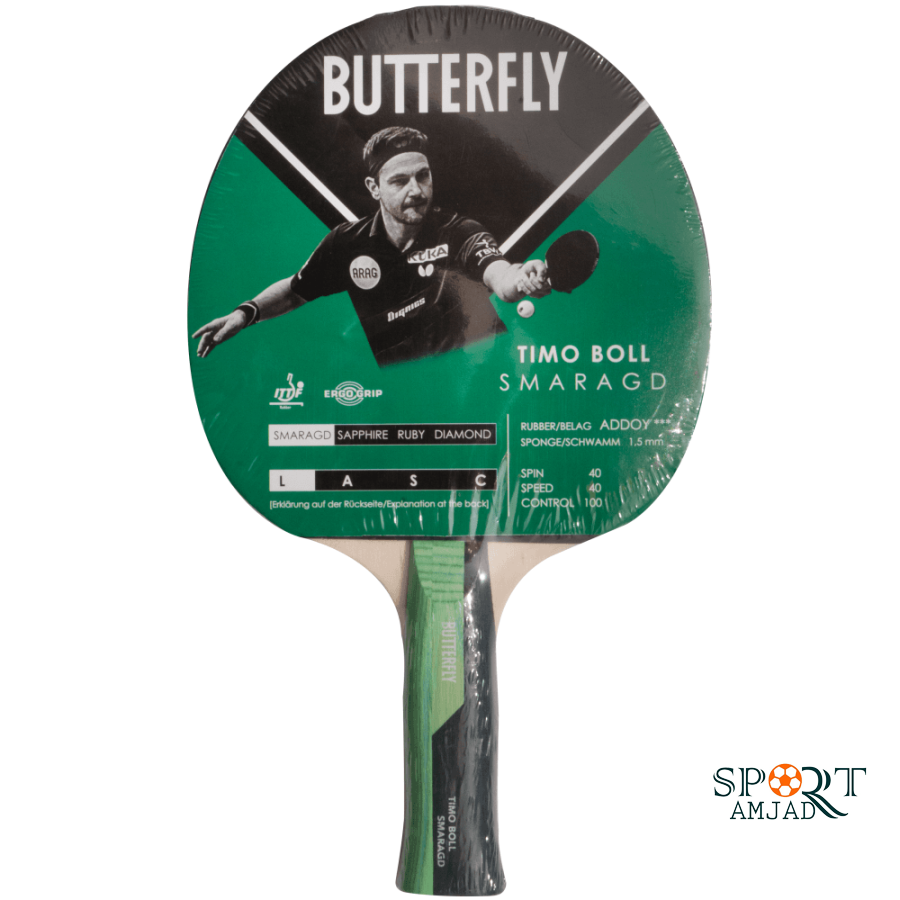 يتميز Timo Boll Smargd بشفرة قوية من 5 طبقات مع مقبض جذاب ومريح على شكل مقعر. هذا جنبا إلى جنب مع الفراشة ITTF المعتمدة من المطاط Addoy الأحمر والأسود مع الإسفنج 1.5 مم يوفر الخفافيش مع دوران جيد وسرعة جيدة والتحكم الممتاز. حافة الشفرة محمية بشريط جانبي للفراشة.